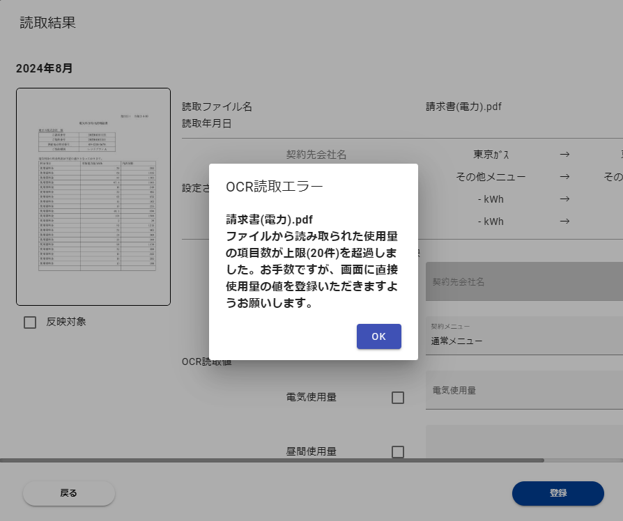 請求書のOCR読取機能について、読取りが可能なエネルギー使用量の項目数上限を20件といたしました。