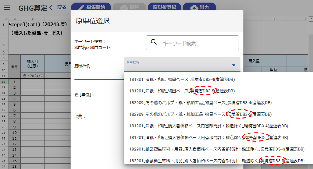 Ver.3.5の排出原単位を選択する際は、GHG算定画面にて緑色のセルをダブルクリックし、原単位名に「環境省DB3-5」が含まれるものを選択ください。