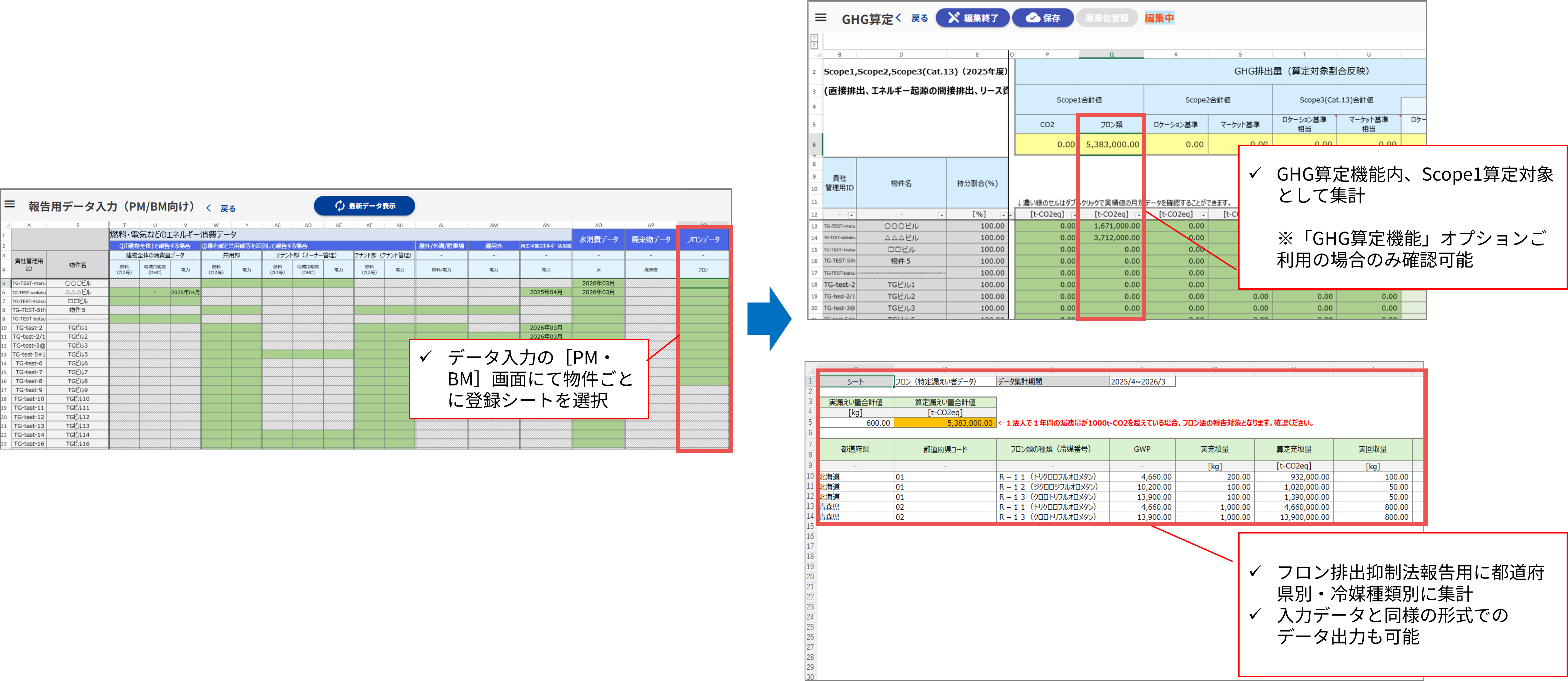 - PM/BM向け画面より都道府県、フロン類の種類、実充填量等を対象物件ごとに登録すると、GHG算定機能のScope1への自動集計や、詳細データ出力画面にて「フロンデータ集計」の出力が可能です。