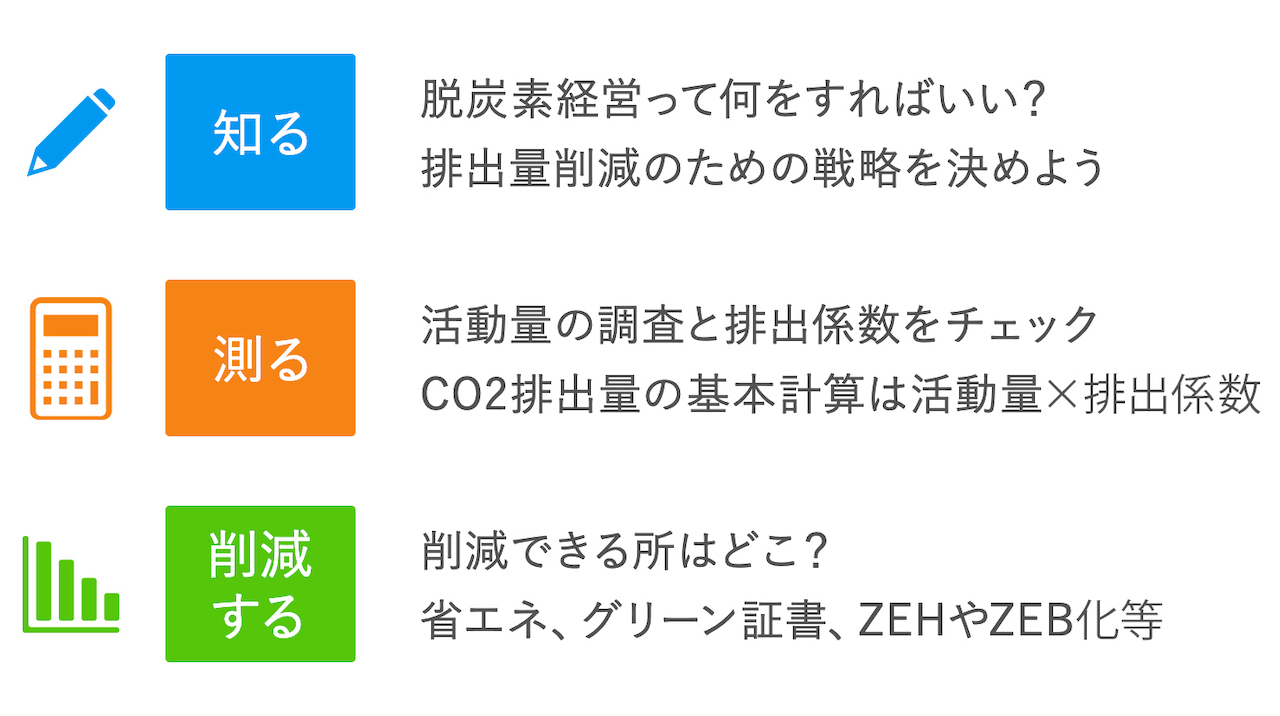 脱炭素経営に必要な3ステップ「知る」「測る」「減らす」