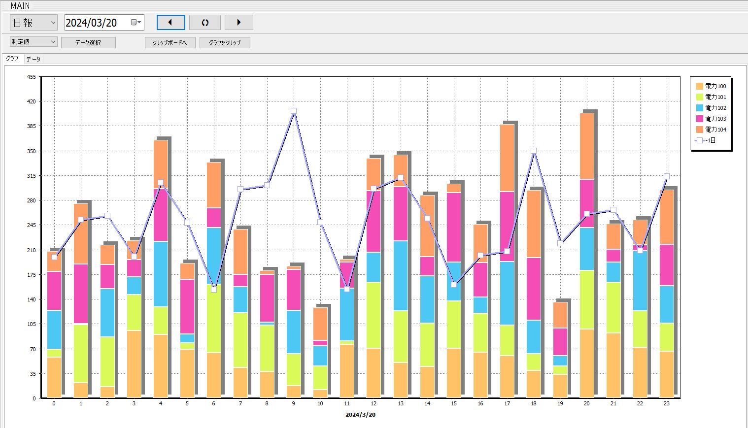 収集したデータは、エネルギーの使用量を電力種別ごとの積み上げグラフで表示したり、温度などのセンサー情報を折れ線グラフで表示したりと、視認性のよいイメージで表示できます。そのため、例えば「工場全体の使用電力がピークに達した際、どこの製造部門で最も電力が使われているのか」といったことも一目でわかります。表示するデータは、必要に応じて、日報、月報、年報への切り替えも可能です。
