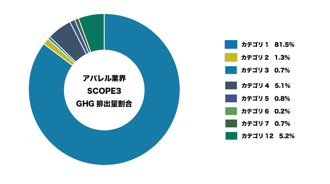 以上より、アパレル業界におけるScope 3のGHG排出量はカテゴリ1、カテゴリ4、カテゴリ12の3カテゴリからの排出が多いことがわかります。