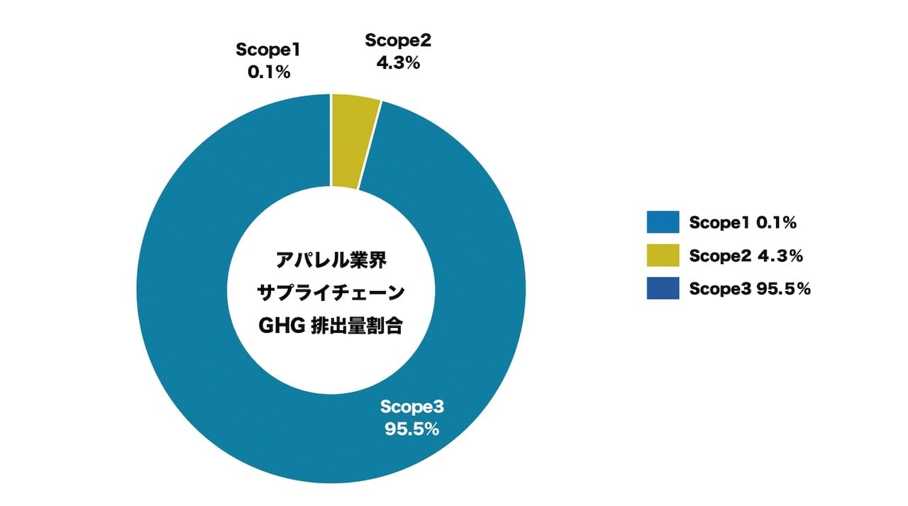 アパレル業界ではScope 3からのGHG排出量がScope 1〜3の割合のうち大部分を占めており、その割合は全体の95.5%でした。アパレル業界においてGHG排出量の削減を図る上で、Scope 2とScope 3のGHG排出量削減方法を検討することが重要と言えます。