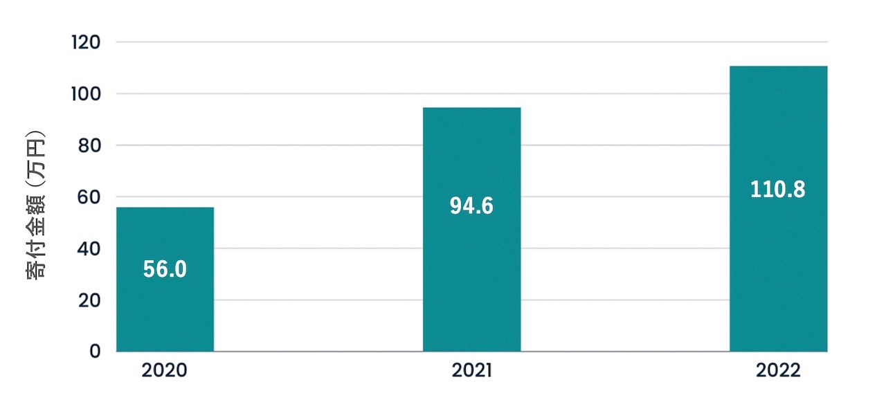 この取り組みによる寄付金額は年々増加しており、以下のグラフの通り2022年には110.8万円になっており、3年間で約250万円が寄付されています。この取り組みはScopeのGHG排出量を削減するための具体的な対策ではありませんが、寄付を通して企業価値の向上に役立てています。