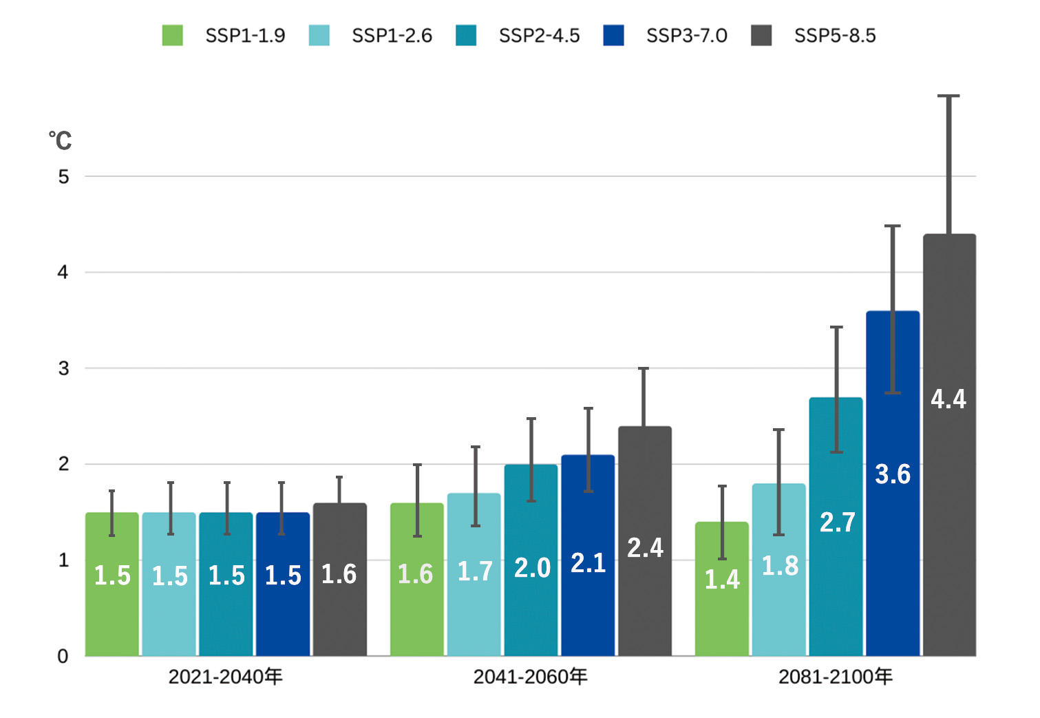 また、気候変動対策を何も行わない最悪のシナリオである「SSP5-8.5」では、地球の平均気温は2081年から2100 年の間に3.3〜5.7℃上昇するとされています。