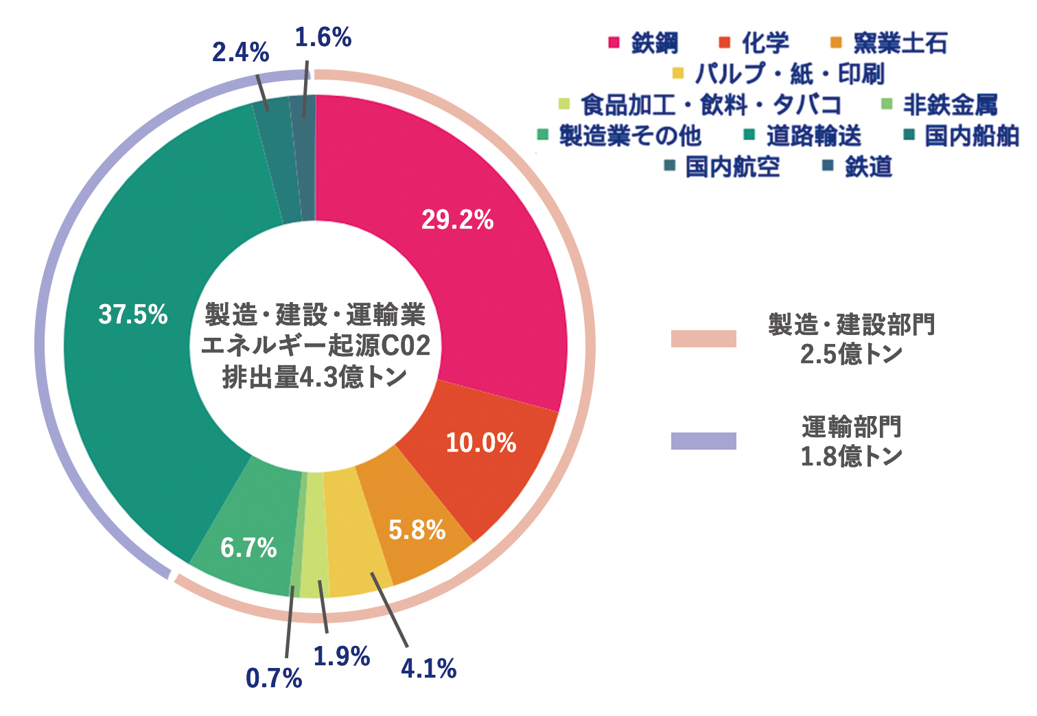 このデータから、製造・建設部門と運輸部門においては鉄鋼の生産の際のCO2排出を抑え、輸送ではガソリンや灯油から電気や水素で走る車両への置き換えが必要になると考えられます。