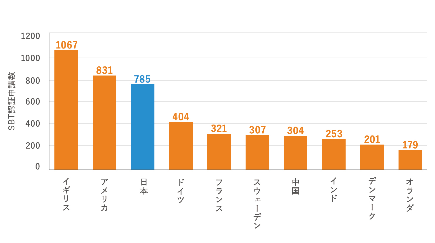 続いてはSBTについてです。以下のグラフは2023年11月現在の国別のSBT認定申請数を示していますが、申請数が最も多い国はイギリスで1000社を超えています。2位がアメリカで831社、3位が日本で785社が申請しています。