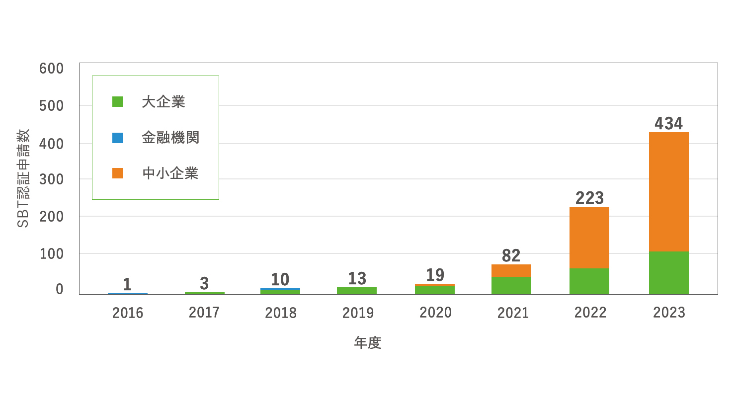 国内のSBT認定の申請は以下のグラフの通り年々増加傾向にあります。特に中小企業の申請数が多いことも日本の特徴です。