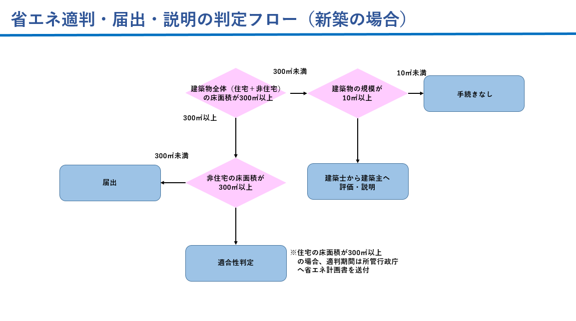 住居目的以外の建設物は、床面積によって届出や適合性判定を受ける必要があります。なお住宅でも床の面積が300㎡以上なら、所管行政庁に省エネ計画書を提出します。