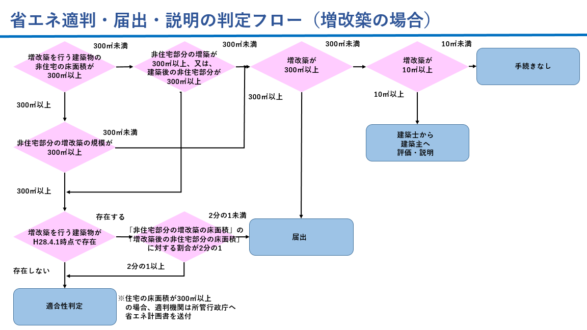 また、住居目的以外の建設物を増改築するために、各種届出や適合性判定が求められるかどうかは、増改築を行う規模によって異なります。住宅でも床の面積が300㎡以上になる場合は、所管行政庁に省エネ計画書を提出しなければなりません。