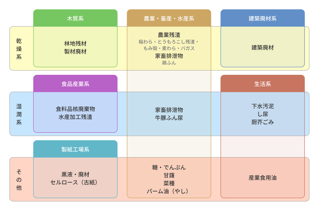 バイオマス原料は「材料」と「状態」の組み合わせによって、9つのカテゴリーに分類できます。