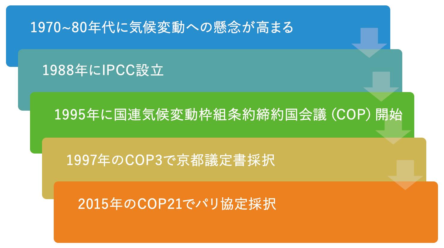 このような背景から、世界各国や国際連合は気候変動へ危機感を持つようになり、1985年には世界各国の政府と国際連合の専門機関である国連環境計画(UNEP)が気候変動への対策を行うべき、と発表。以降、気候変動問題は世界的な注目を集めると、1988年、UNEPと世界気象機関(WMO)によりIPCCが設立され、温暖化を含む気候変動に関する調査が世界的に始まりました。