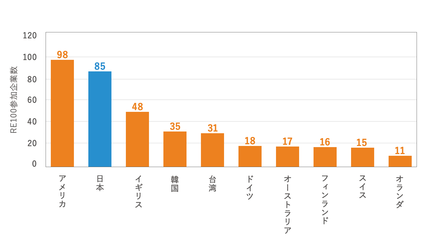 日本企業のTCFDやRE100への参加も盛んであり、2023年11月現在では日本のTCFDの賛同企業数は1488社で1位、RE100への参加企業数は85社とアメリカに次いで2位となっています。