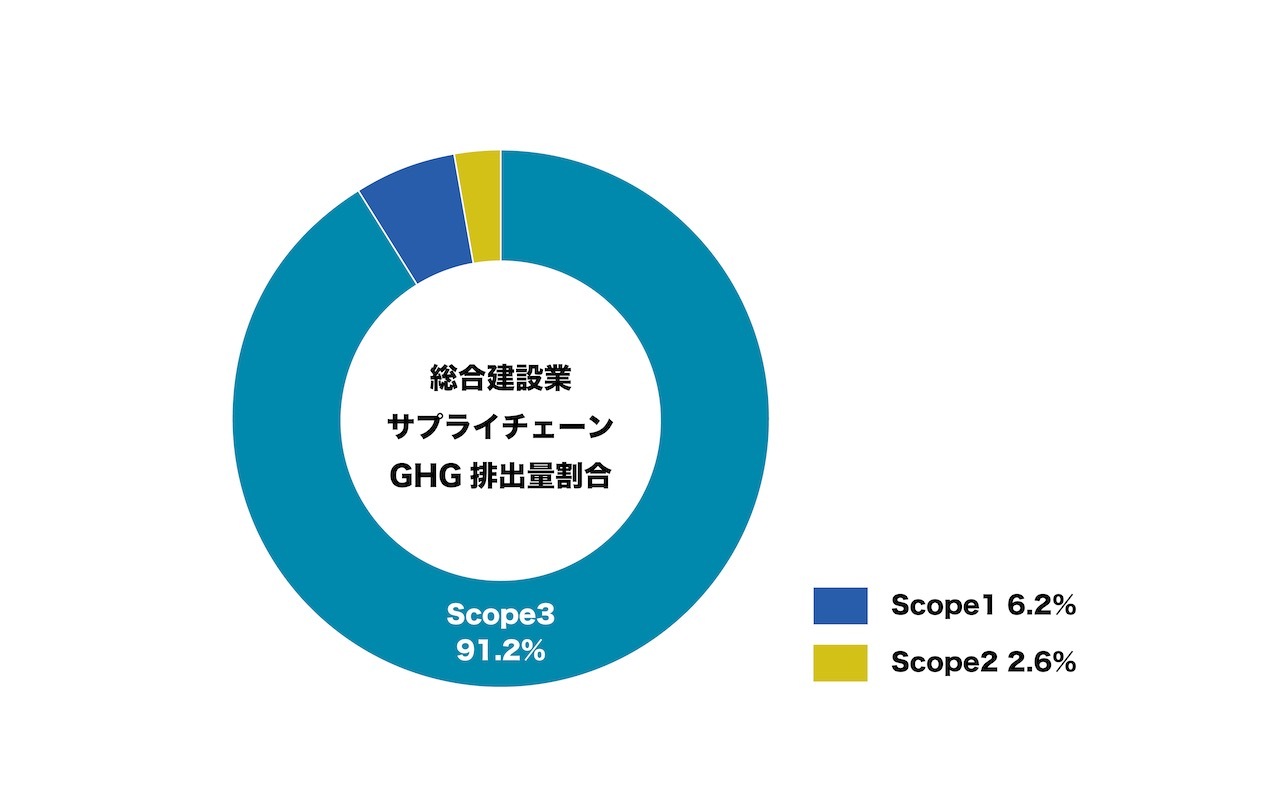 一方で、Scope 3からのGHG排出量は91.2%を占めています。中でもカテゴリ1「購⼊した製品・サービス」およびカテゴリ11「販売した製品」からのGHG排出量が全体の80%以上を占めていることがわかります。中でもカテゴリ11からのGHG排出量は全体の排出量のほぼ半分を占めています。つまり、大手の総合建設業においてはScope 3のカテゴリ1およびカテゴリ11のGHG排出量を減らすことが不可欠と言えます。