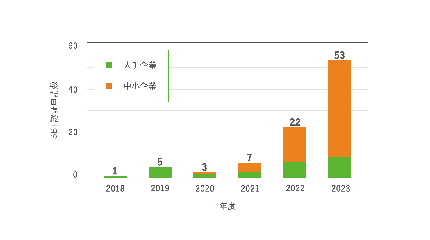 結果、2018年に1件であった申請が2023年の12月には53件に増えています。申請数は大企業よりも中小企業の方が多くなっており、建設業界では気候変動対策に関心を持ち、実際に行動を起こしている中小企業が多いことを示しています。